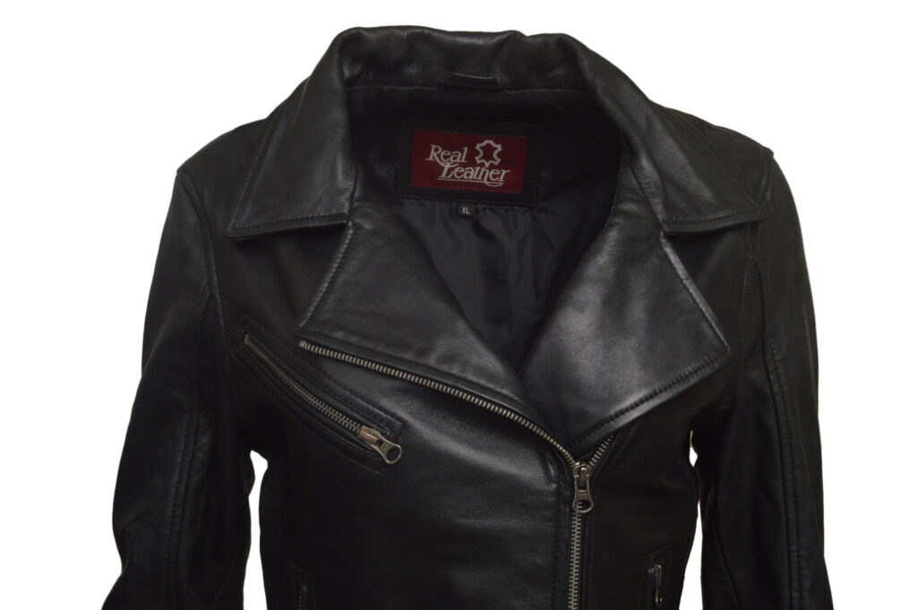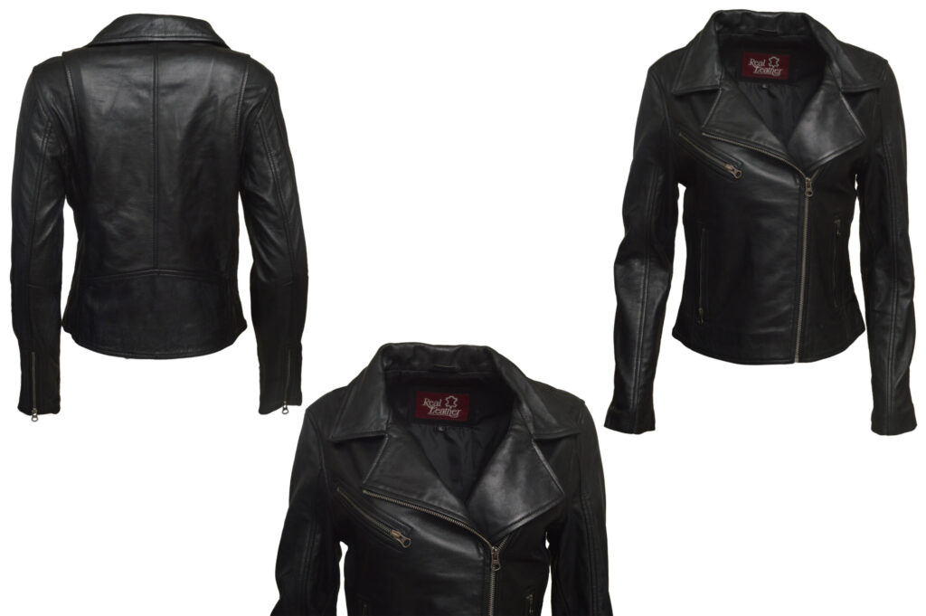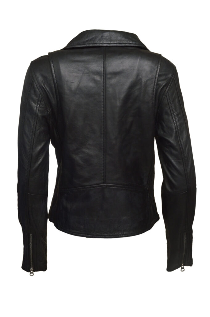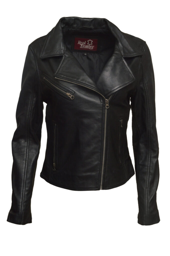 Sandy3 is a sleek women’s leather jacket crafted from 100% genuine sheep waxed leather in classic black. Featuring a full-zip front with stand-up collar, YKK zippers, zip-style sleeves, and multiple pockets, it offers a stylish, lightweight, and comfortable look ideal for everyday wear.